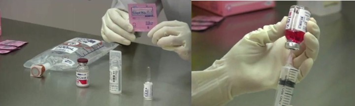 第3部の無菌調製の実践では、手洗い、スタンダードプリコーション、ガウンテクニック、注射針や注射シリンジの扱い方、輸液への混注(アンプル、バイアル、輸液ボトル)、配合変化の確認、鑑査方法などについて3種類の注射箋を用いて実践していただきます。